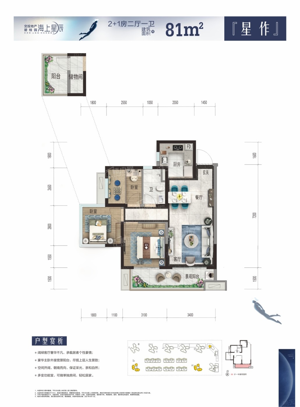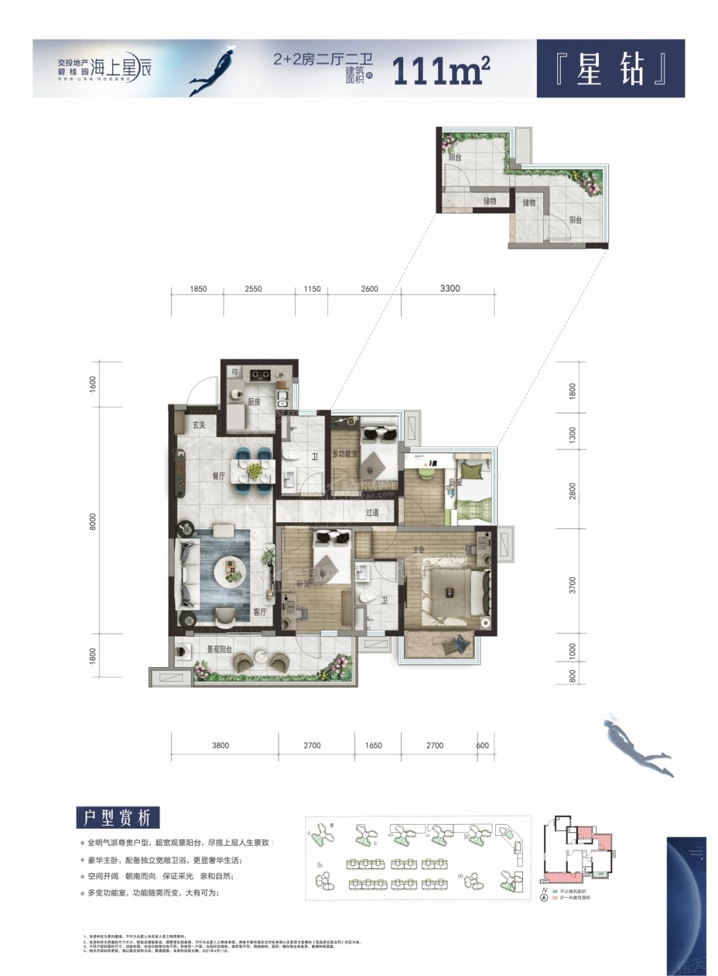 交投海上星辰共有7个户型,当前有5个户型在售,111㎡的4室、81㎡的3室、128㎡的5室、112㎡的4室、79㎡的3室、177㎡的4室、168㎡的4室。具体户型情况如下